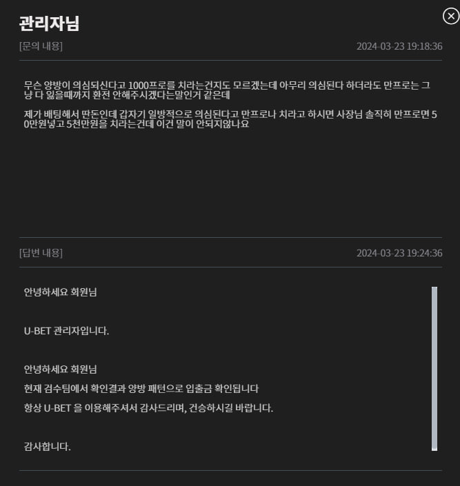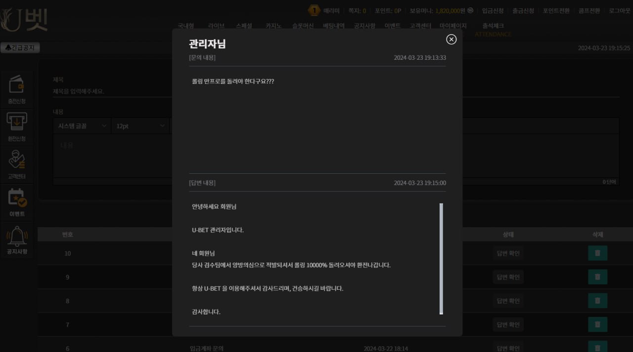 4일차에 환전 눌렀더니 양방의심이라고 롤링 10000% 치라고함