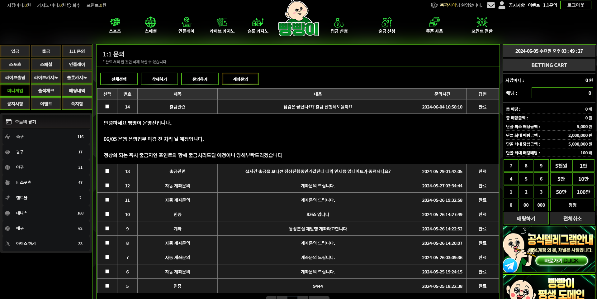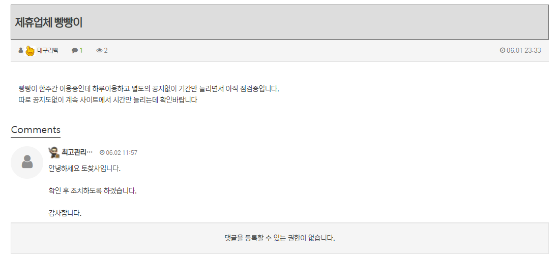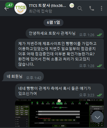 ![]() ![]() ![]() ![]() ![]() ![]() ![]() ![]() ![]() 안녕하세요 친구 따라 토찾사 안에 배너들을 이용하려했는데 평소 좋아하는 캐릭터이기도 하고 해서 빵빵이라는 사이트를 이용하게 되었습니다. 근데 현재 별도의 공지없이 포인트 더 주겠으니 입닫고 기다리라는 식으로 나오고있습니다 어떤 사이트가 점검을 일주일 이상 씩이나 합니까? 점검끝나고는 되겠지 하고 오늘까지 기다렸다가 오늘 오후 5시경 환전신청 눌렀지만 점검중으로 도메인 접속도 막아놨습니다. 환전 버튼없고 사이트열었다가 점검했다가 반복하는 사이트입니다. 이용중지하세요 돈들어오면 글 내립니다. 현재 토찾사 측에는 고객센터에 문의해도 알아보겠다고만 하고 나몰라라 식이며 보고 들어간 회원들 개바보취급하는거 같습니다 조심하세요. 지인 피셜 빵빵이 (앞전 초롱이 사이트) 빵빵이.2.점검중 댓글 0