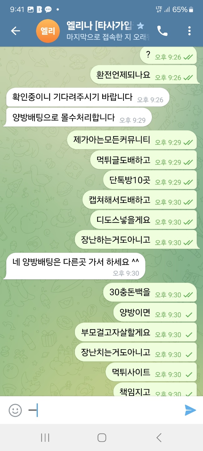 5번 150넘게 충전할동안 첫환전 35충해서 일야 2폴더 121환전 말같지도않은소리하더니 이체내역보내라 국밥내역 2주치 다보냈더니 할말없으니 20분동안 씹다가 환전 언제되냐고 물어보니 양방이라고 차단 입금 먹튀사이트 토토10년하면서 이런사이트는 또 처음보네요 사이트 내려갈때까지 단톡방. 토토 커뮤니티 디도스 할수있는건 다해야 저도 분이 풀릴거 같네요 사이트 내려갈때까지 매일 도배하겠습니다