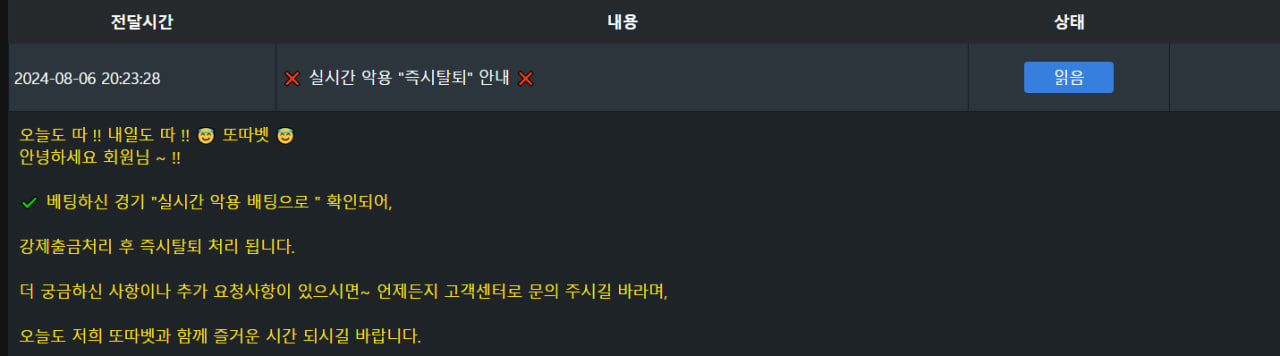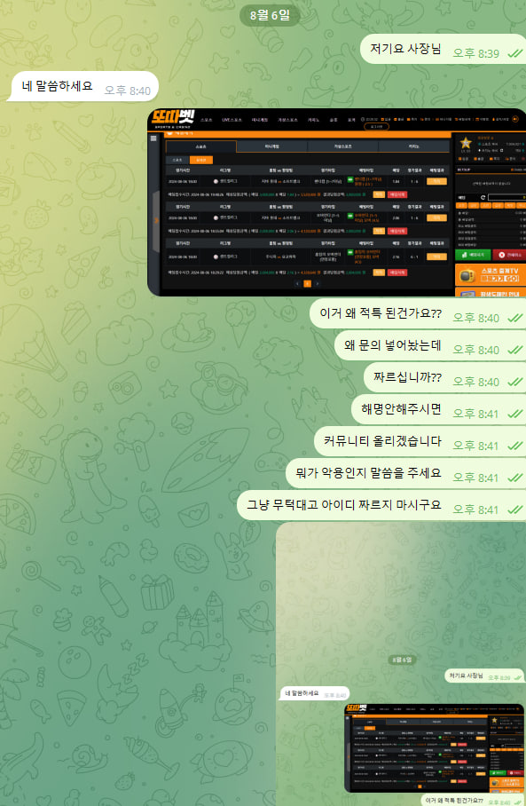 그냥 지고있을때는 가만히 있다가 먹을각 나오니까 갑자기 올적특 원금처리 악용배팅 드립치네요 어이가 없어서 뭐가 악용이냐고 납득 할수있게 설명을 해달라고하니 아이디 바로 짤라버리고 텔레그램 차단 박아버리네요 또따벳 지금당장 이용 멈추세요