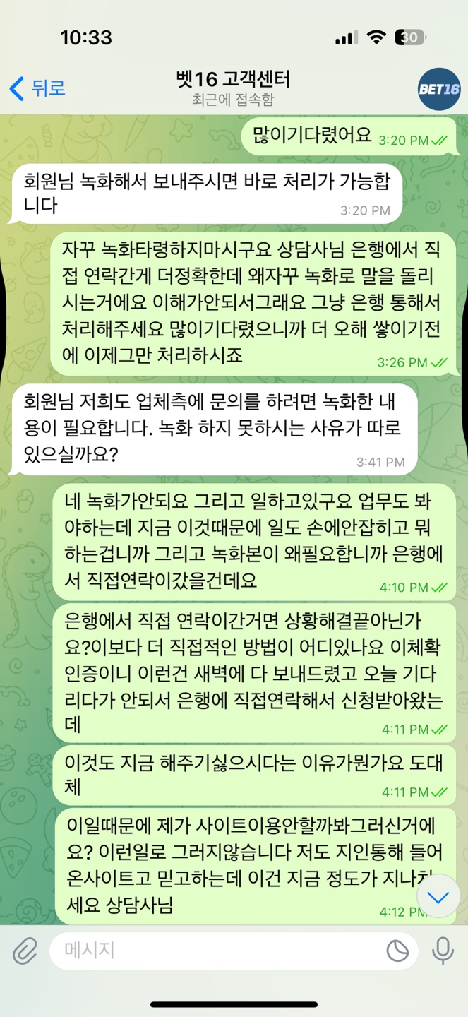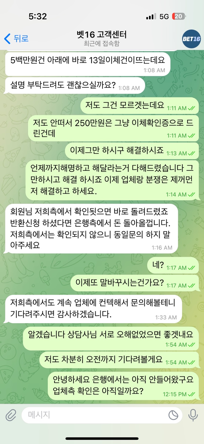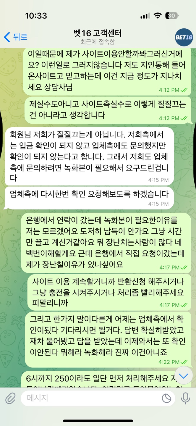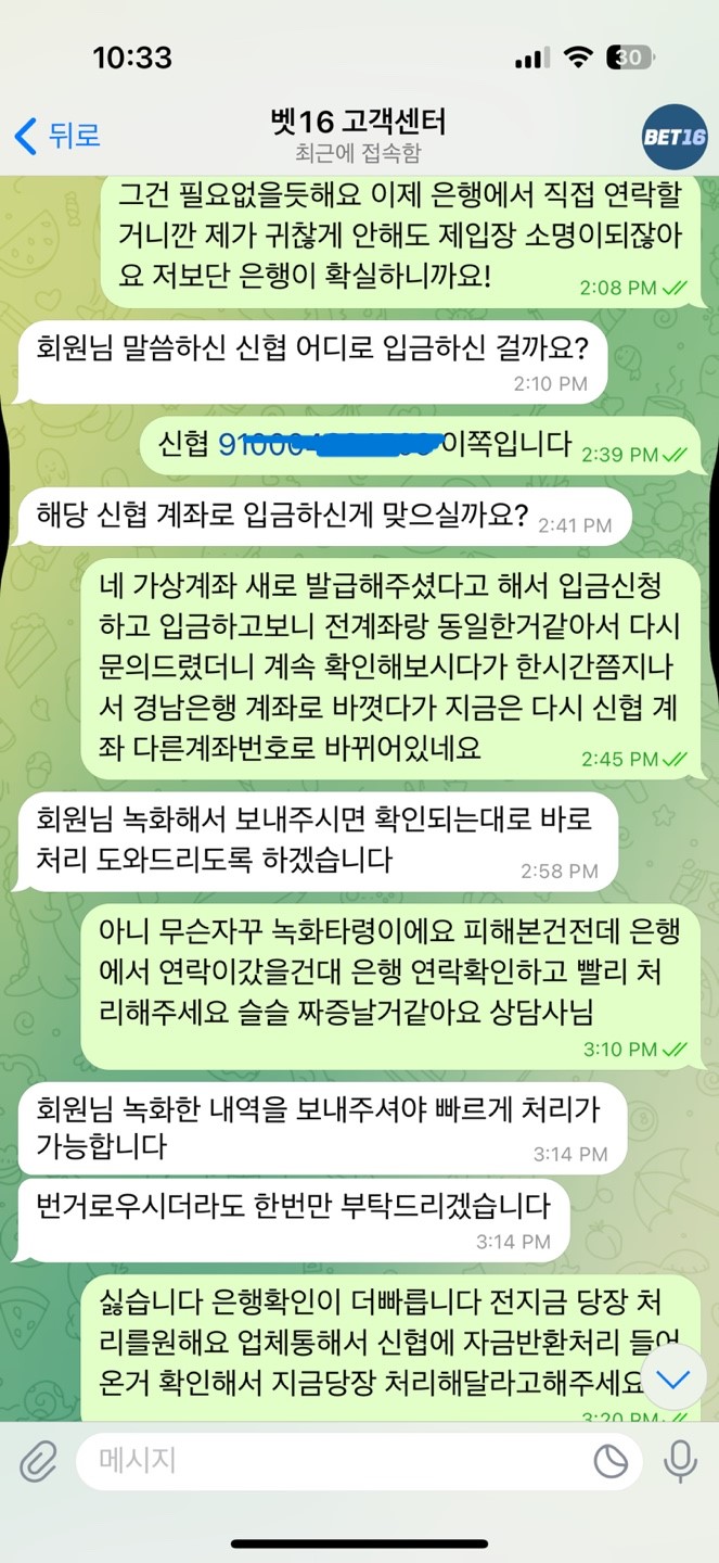 ![]() ![]() ![]() ![]() ![]() ![]() ![]() ![]() ![]() ![]() ![]() ![]() ![]() ![]() 안녕하세요 벳16을 이용한지는 얼마되지않았습니다 아는지인통해서 환전도 잘나오고 보너스도 좋다고 하여 원래사용하던사이트를 뒤로하고 사이트를 옮겼습니다. 따는날도 있고 잃는날도 있고 현재 -3800정도 잃은상태에서 며칠 쉬었다 해야 생각하고 쉬고있었는데 보너스 위로전화차 연락이왔고 연락을받고 다시접속해서 보너스포인트도 사용하고 잘이용하고있었습니다 근데 상담사분이 가상계좌를 새로발급해준다고하여 알겠다고하고 인증번호 불러주고 새로발급이 완료되었다고 하였습니다. 그래서 이제 입금을 하였고 500이상은 한번에 입금이안되어 500 / 250 총 750만원을 입금하였는데 입금하고 보니 입금계좌정보가 전에쓰던 가상계좌라 새로발급해도 똑같은건가 하다 혹시몰라서 상담사분에게 문의를했습니다. 근데 처음엔 그럴일이없다고 제대로 등록이되어있을거라고 했습니다. 하지만 제가 캡쳐본을 계속 보내드린 결과 등록이 잘못된거같다고 답변을 받고 새로 다시 등록을 해놓았다고했습니다. 그랬더니 계좌가 그제서야 바뀌더라구요. 그래서 이미 제가 입금한 750만원은 처리가 언제쯤되냐고 여쭤보았더니 업체측에 확인요청한 상태고 기다리면될거라고해서 기다렸습니다. 근데 연락이 계속 안와서 재차문의해서 처리가어려운거면 은행에 반환처리를 하겠다 수락만 해주셔라 라고이야기를했더니 업체측에서 입금확인이됬다 곧 다시 반환처리가 될거다 기다리셔라 라는 답변을 받았습니다. 근데 돈은 돌아오지않고 계속 기다리기만 똑같은 말만 반복하더니 입금내역 이체증을 보내달라고 하더군요 그래서 다보내드렸습니다. 그래도 처리가안되서 그냥 내일 오전까지 기다리겠다 꼭좀 처리해달라고 기다렸습니다. 하지만 오전에도 그날 오후에도 처리가안되고 다른 상담사가 연락이오더니 녹화본을 보내달라고하더라구요 그래서 사이트과실로 피해를본건 난데 왜 내가 이러고있어야하냐 그냥 은행에 반환처리 넣을테니 확인되면 수락만해달라 얘기를했습니다 . 그게 제일 확실한 방법일거니까요 증명도 확실하고 계속 녹화본을 주면 처리가 빠르다 바로 저희가 처리해드릴게요 재차 물어보고 답을받고 일을마치고 결국 녹화본을 보냈습니다. 그결과 갑자기 그냥 은행반환처리 기다리세요. 똑같은문의하지마세요 그러고 맙니다.... 지금은 현재 문의도 안하고 그냥 믿고 기다리는중 입니다. 이런 비슷한 상환 겪어보신분 있으신가요 돈은 750정도인데 크다면크고 작으면 작은돈인데 배팅해서 잃은거면 신경안쓰이겠는데 이렇게 아무것도못하고있으니 아무것도 손에안잡히네여... 바카라는 처음이라 2억정도만 딱 승부보고 그만하려고했는데 맘이 아프네여 사이트랑 서로 오해나풀고 잘마무리됬으면 좋겟네요 ㅠㅠ 가상계좌 반환이 가능한건지 이러한 비슷한상황에서 해결보신분 있으면 댓글좀 부탁드려요 ㅠㅠ 속이 너무쓰리네요 휴........-3800보다 750이 왜더쓰린지 ....... 곧 2틀쨰되네요 ㅠㅠㅠ |