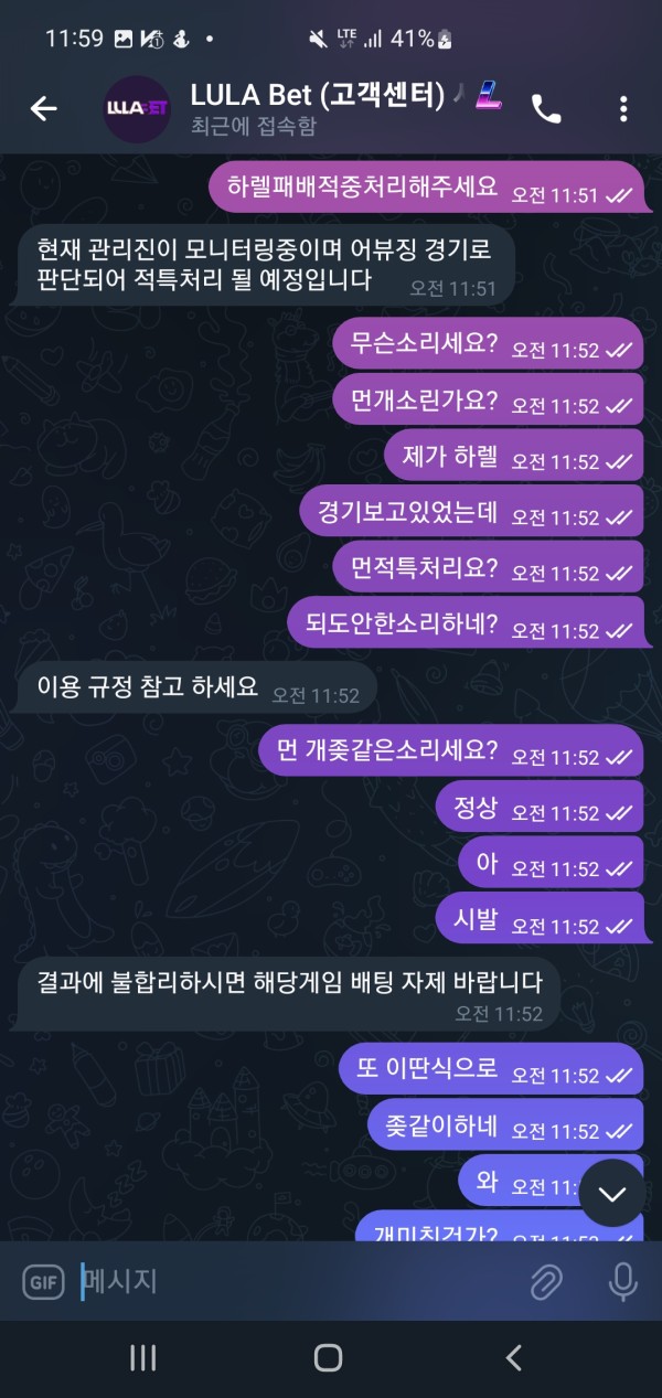 룰라벳에서 절대 이용하지마세요 여기서 5년넘게이용했지만 이제는  유저돈을 아예 명분없이 삼킬려고하네요 bj 롤크리에이터경기가있는데  여기에 배팅하고 경기를 끝까지보고 마지막에 경기끝날때쯤 서렌치고 나가고 배팅적중금지급해달라고하니 갑자기 해당경기 어뷰징이라면서 개좆드립치네요 이건 좀 중대한상황인거같습니다 룰라벳 자기네들이 판단하고 적특처리할지 적중처리할지한다는데 이게 먹튀가아니면뭔가요? 정상적인 진행했는데도 적특처리하는거자체가 그냥 먹튀보다 더 양아치아닌가싶네요 다른분들도 꼭 여기서 배팅하지마시길바랍니다 끝까지가자 룰라야
