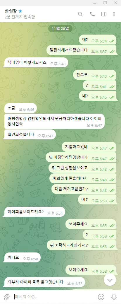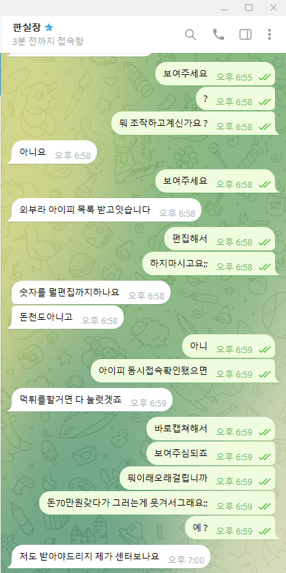 70만원도 없는 개구멍사이트 20충해서 70따갖고 환전할라니까 취소놓더니 아이피가뭐니 개드립치면서 돈안줍니다 그런증걸 보이라니까 답변도 한참늦더니 편집해서 보여줄라는거같고 이용하고 계신분 있음 중지하세요 호주머니에 천원짜리 한장없는곳입니다 환전버튼은 폼으로 달고있고 암튼 개병신사이트입니다 구영탄 텔레그램 한실장 텔 아이디 @han2191 개먹싸 총판 거르세요~