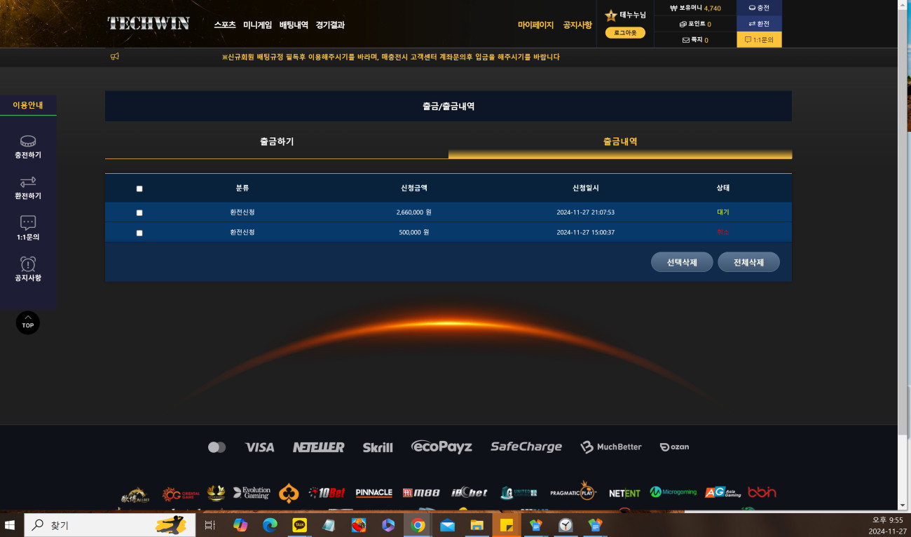테크윈 byn25.com 50 입금하고 266 환전하려니 고객센터 답변도 없고 환전도 안해주네요 이 사이트 환전 안나오는 곳입니다 절대 입금하지 마세요