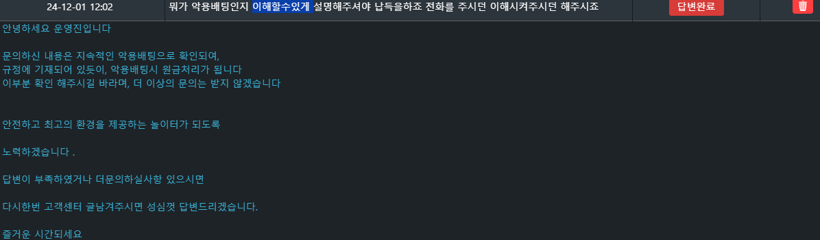 미나리고 지랄이고 당첨되니까 악용배팅이라고 느그나라 소련말 지끼면 끝이냐? 몇일전엔 경기 시작되고 30분뒤에 취소놓더만 그거 이해해주고 이용해줬으면 감사한줄 알아야지 개 비응신 찌꺼기 조빱 사이트야 이거 보고 꼬우면 전화해라 목아지 볿아 비틀어벌기 전에