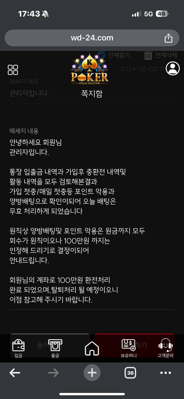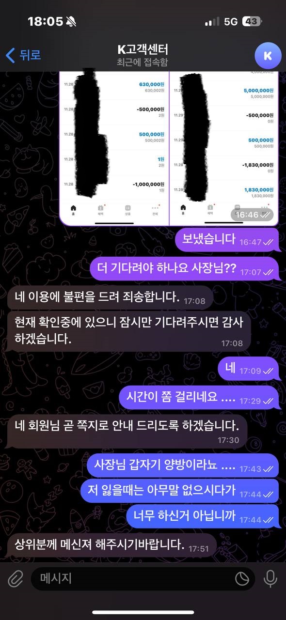 이용인데 첫번째 이용할때는 잃으니까 암말 안하다가 겨우 본전 찾았는데 환전 취소시키고 롤링 굴렷는데도 더치라고 하드만 롤링더 치고 다시환누르니까 텔레 달라해서 이체내역 까라고 해서 주니까 더 달라고 똥개 훈련 시키드만 기다리게 계속 말없으니까 쪽지로 그냥 100줄테니까 먹고 떨어져라는 식으로 말해버리고 무슨 따니까 양방 드립이냐고 따지니까 우리는 모르겠고 그냥 상위한테 연락하라고 하고 귀닫아 버림