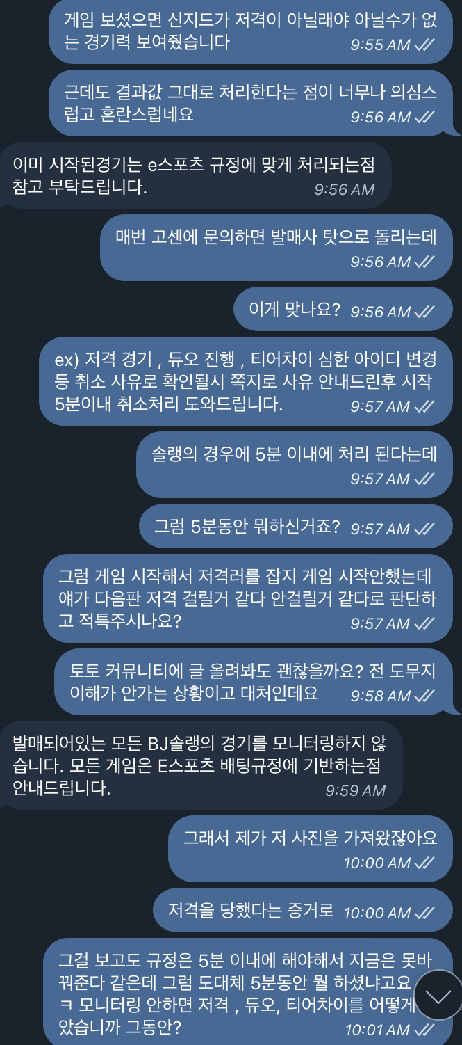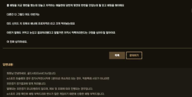 ![]() ![]() 현재 골드시티 내에 E스포츠를 발매하고 있습니다. bj들의 솔랭,스타,피파 등등 여러 게임도 있습니다 그 중 bj 솔랭을 제가 배팅을 최소 150번 이상은 했을거 같습니다 bj 솔랭의 규정사항을 보시면 ex) 저격 경기 , 듀오 진행 , 티어차이 심한 아이디 변경 등 취소 사유로 확인될시 쪽지로 사유 안내드린후 시작 5분이내 취소처리 도와드립니다. 라는 규정이 존재합니다. 하지만 이 규정은 제대로 이행되지 않고 있습니다 누가봐도 저격의심이 드는 게임은 결과값을 그대로 내고, 저격 의심이 없는 게임에는 저격 의심이라고 적특처리를 합니다. 그간 확실한 정황과 증거가 불충분해서 제대로 문의하지 못하고 넘어갔지만 오늘 확실한 증거로 저격러의 유튜버를 찾아 보여주었으나 역시나 무시한 채 결과대로 한답니다 골드시티 이용하시는 분들은 절대 E스포츠 건들지 마십쇼 이용 안하시는 분들이라면 골드시티 악질 사이트 건들지 마십쇼