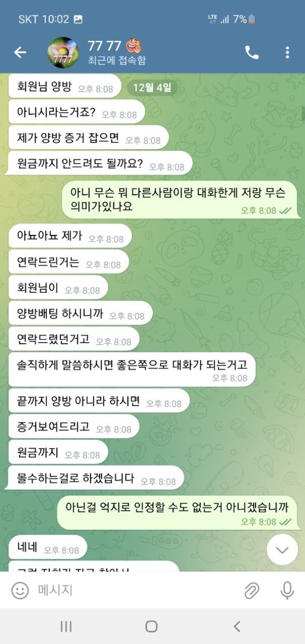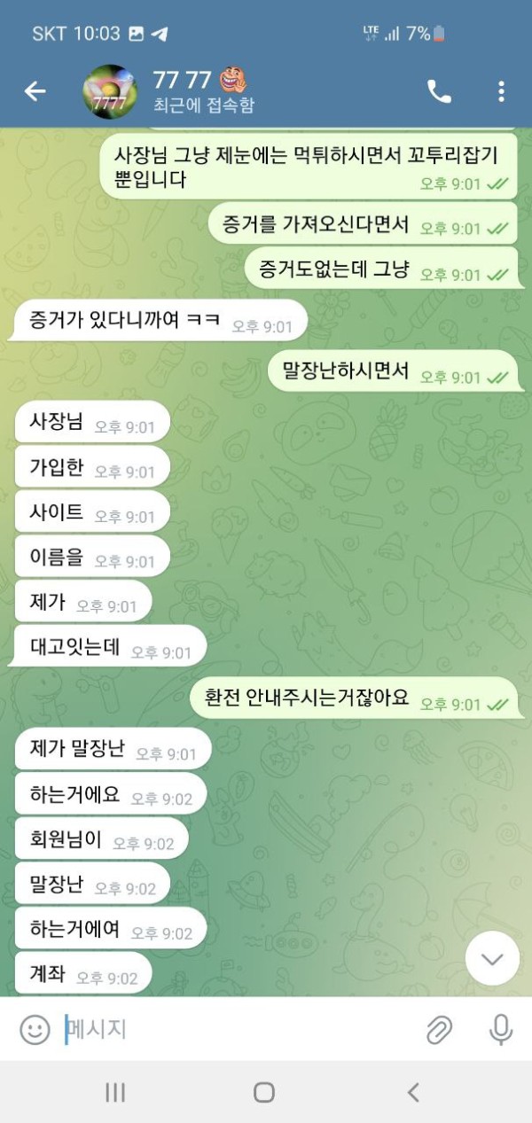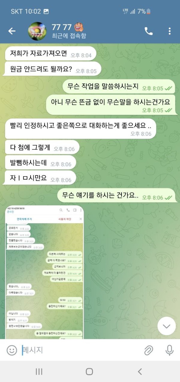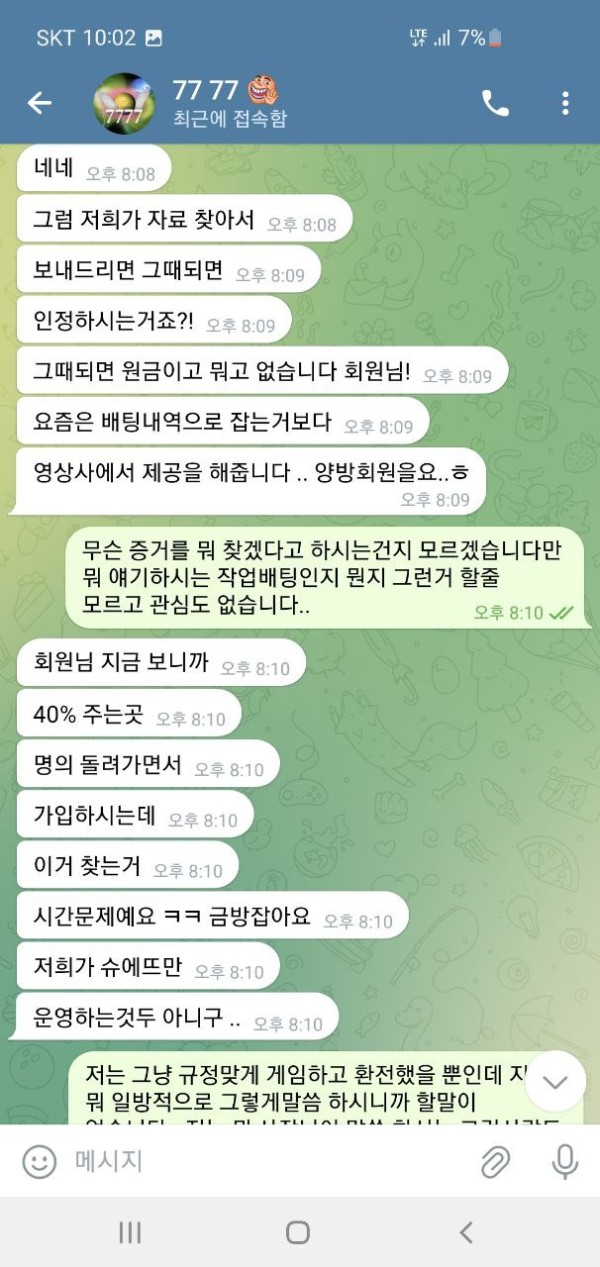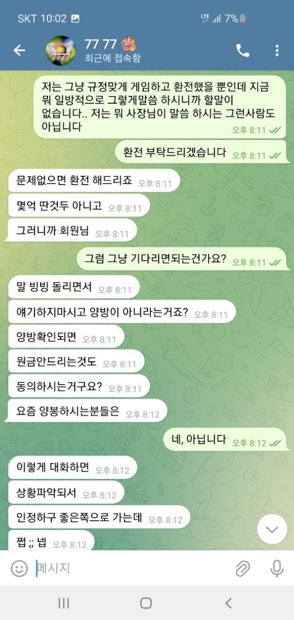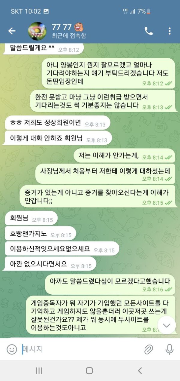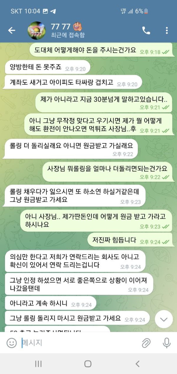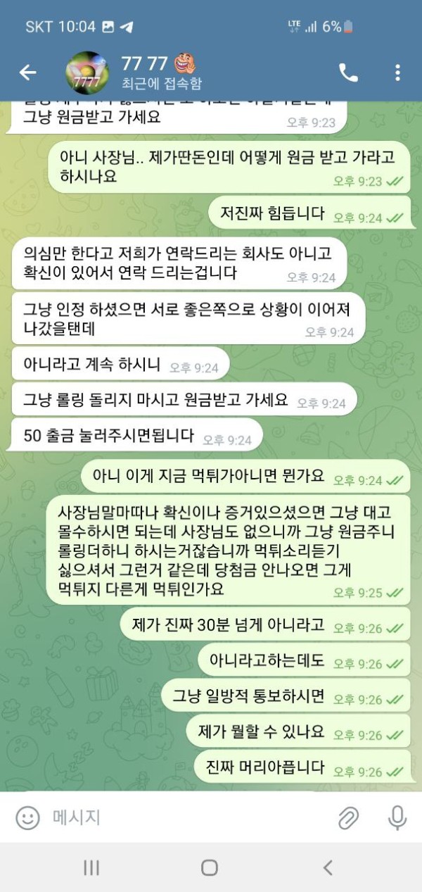 오늘 슈에뜨라는 사이트 홍보를 보고 가입해서 이용했습니다. 50만원 충전하였고 운좋게 160만원 까지 가서 환전을 눌렀습니다. 그런데 텔레 달라고 하더라구요. 그래서 텔레 했더니 뭐 몇가지 확인을 한다길래 알겠다고 했고 요구한 계좌 내역이랑 뭐 이것저것 보내줬습니다. 하나를 보내주면 둘을 요구 하고 그래서 진짜 계속 뭐 보내줬고 30분 1시간을 대화했습니다. 그러더니 결국에는 마지막에는 추가롤링을 하실래요 원금을 받으실래라고 하더군요, 그래서 추가롤링 얼마나 하면 돈을 받을 수 있냐니까 그냥 원금 줄테니가라고 그러고는 원금 띡 넣어놓고 아이디탈퇴시켜놨네요. 세상에 믿을게 없다지만 그냥 당신 작업자네요 이 한마디로 그냥 싹 다 먹튀하는게 말이나 되나요? 증거도 당연히 없고 당연하다는 듯이 먹튀하네요 그냥 애초에 환전버튼 자체가 없는 곳입니다. 그냥 이기면 돈을 안줍니다. 제가 작업자가 아니니까 꼬투리를 잡을래도 잡을게 없으니 원금이라도 내준거지 그냥 자기네들도 전부다 꼬투리라면서 얘기하더군요. 그냥 애초에 환전하면 작업자로 몰아가고 꼬투리 잡으면 몰수 못 잡으면 원금 줘뿌는 그런 사이트입니다. 다른 게임하시는 분들도 모두 조심하십쇼.. 대화 안통하고 했던 말 계속하고 그런식입니다. 당당하게 꼬투리 잡고 있다고 자기들이 얘기합니다. 뭐 전부가 꼬투리라면서 헛소리 하고 요구한거 또 요구하고 무한반복입니다. 의미없는대화 그만하고 싶다며 헛소리 합니다. 대화 안통합니다. 한시간을 넘게 대화하면서 스트레스만 정말 죽도록 받았습니다. 애초에 110만원도 내줄생각없는데 괜한데 힘뺀것만같고 허무하더군요. 다들 정말 조심하십쇼.