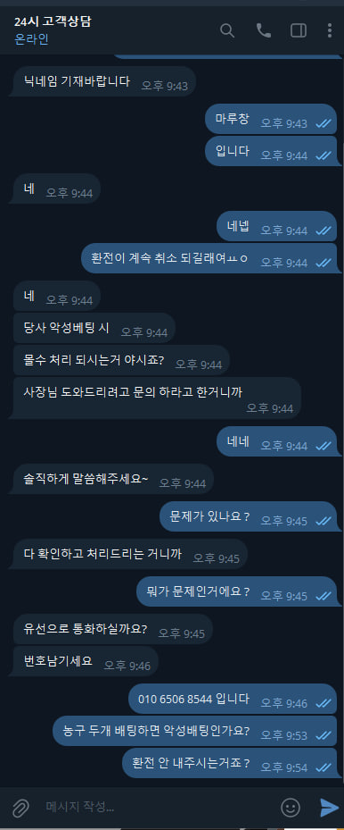 텔레 홍보방 보고 가입해서 농구 배팅하고 환전 넣었는데 갑자기 텔레달라해서 하니까 악성배팅이라고 먹튀하네요. 이용하지마세요~ 133만원 없어서 돈안내줍니다