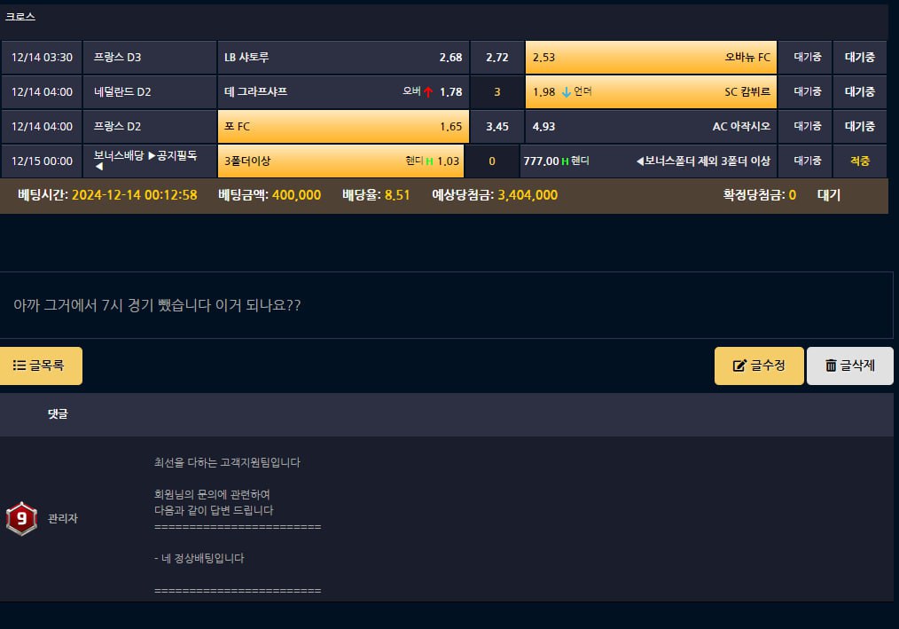 배팅전에 하라는대로 하고 다폴더 배팅했는데 당첨후에 원금 20달랑주고 먹튀했습니다. 머 이런 경우가 다있나요 씨발 진짜 배짱 장사하는것도 아니고 이딴 식으로 사이트 운영하는게 분해서 밤샜습니다. 처리 안되면 매일 먹튀글 작성합니다.