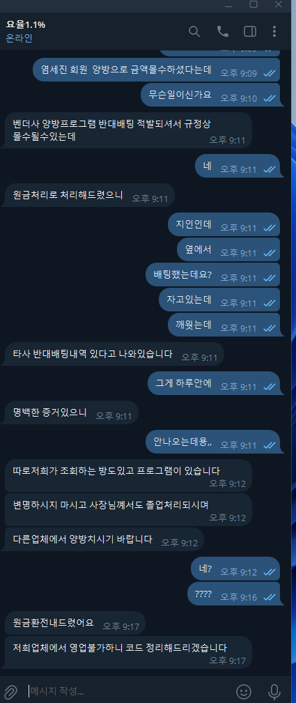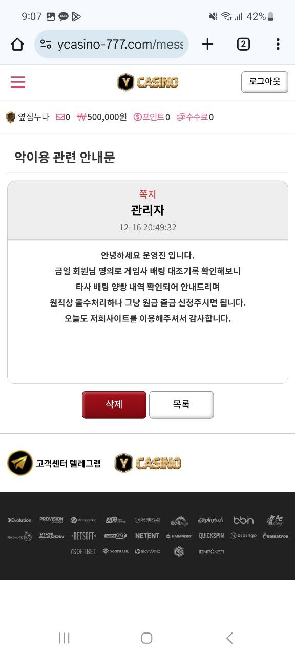 지인이 영업하는 와이카지노 및 에이스카지노 계열사 에서 50출 69환전 양방으로 먹튀당했습니다(참고로 첫매 안받고 요율만 받았습니다 6시간동안 1만원식 마틴으로 먹었는데;;) 소액이긴 하지만 억울해서 글 올립니다 양방내역 보여달라고하니 보여주지도 않고 바로 대화내용부터 밀고 차단하네요 그래도 지인이 소액이라 19만원 개바시를 해줫지만 여기는 혼나야할거같습니다 절대 이용하지마세요 총판코드까지 다감아버리고 도망가는 악질새끼들입니다 말만 하면 구라만치고 다들 먹 당하지 마시고 ^^ 조심하세요 ~