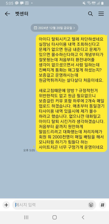 이때부터 원금받자라는 생각으로 알겠다 조회해라 근데 양방배팅은 억울하다 하고 연락달라했는데 조회하면 무슨소용이겠습니까 동일경기 배팅내역이 없을텐데 그때부터는 텔차단 사이트 탈퇴시키네요