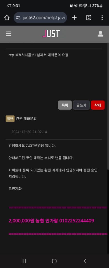 저스트 담당자 고아원 출신 증명 됐습니다 추가롤링 때리더니 원금까지 먹튀 이용중지 하세요 다들