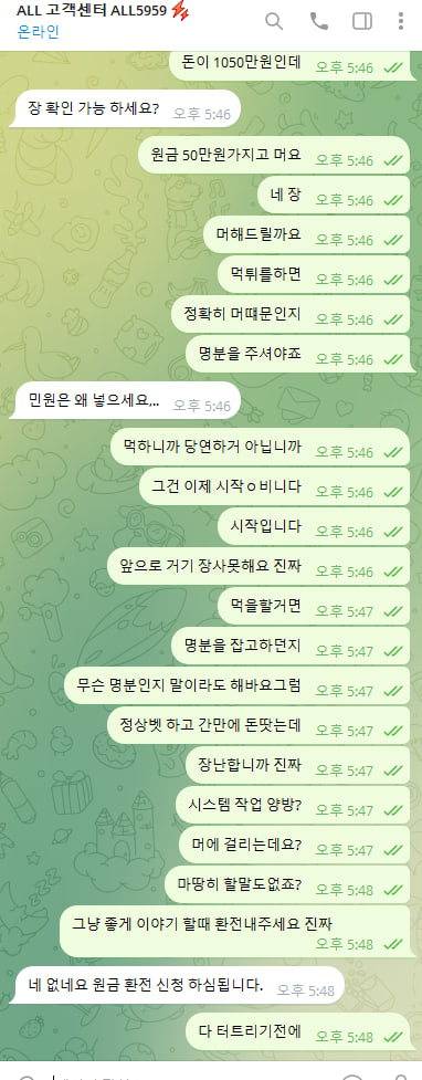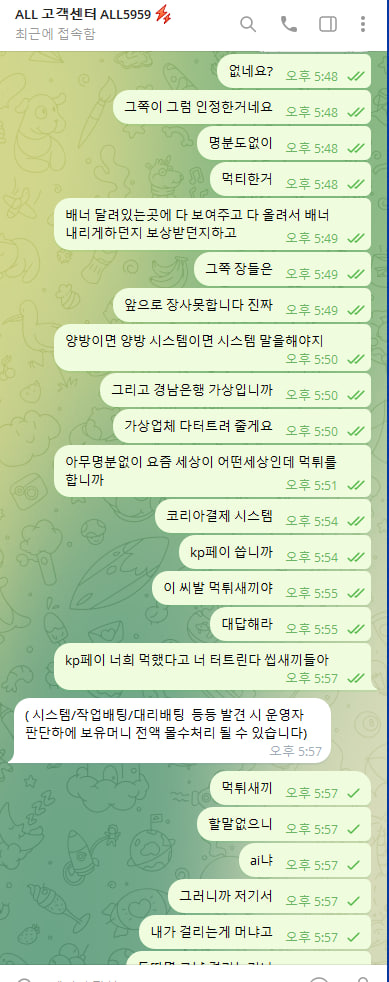 사이트명 : ALL(구 와일드 홀덤) 주소 : https://all-200.com 관련 PG사 : KP페이 계좌 : kp페이 경남 8009805644539 텔레그램 아이디 : @ALL5959 50만 넣고 바카라만 해서 1050만들었는데 명분도 설명도 없이 그냥 먹튀네요. 이전에 와일드로 똑같이 먹튀하다가 이름만 바꿔서 운영하는거 같은데 개 씹새끼들이네요 진짜