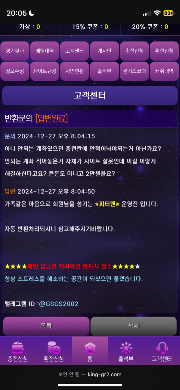 사이트 충전란에 있는 계좌에 2만원 입금했는데 계속 이렇게 답변만 오고 해결해주지를 않네요 애초에 안되는 계좌였으면 사이트측에서 적어놓지를 말았어야지 그냥 개푼돈 먹튀하는 사이트입니다