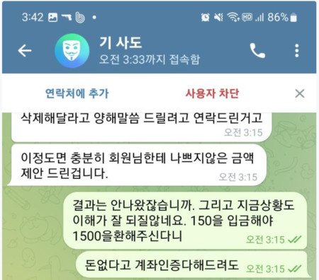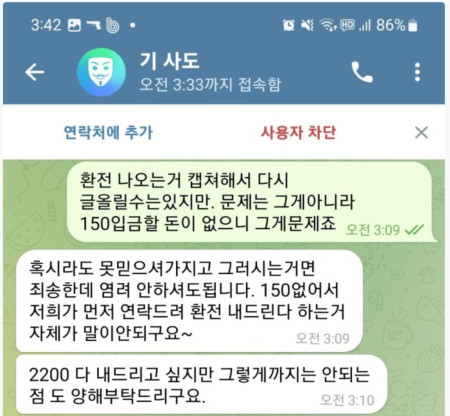 20일 2200만원 먹당하고 오늘 뜬금없이 총괄실장이란 사람한테 텔메세지왔습니다.