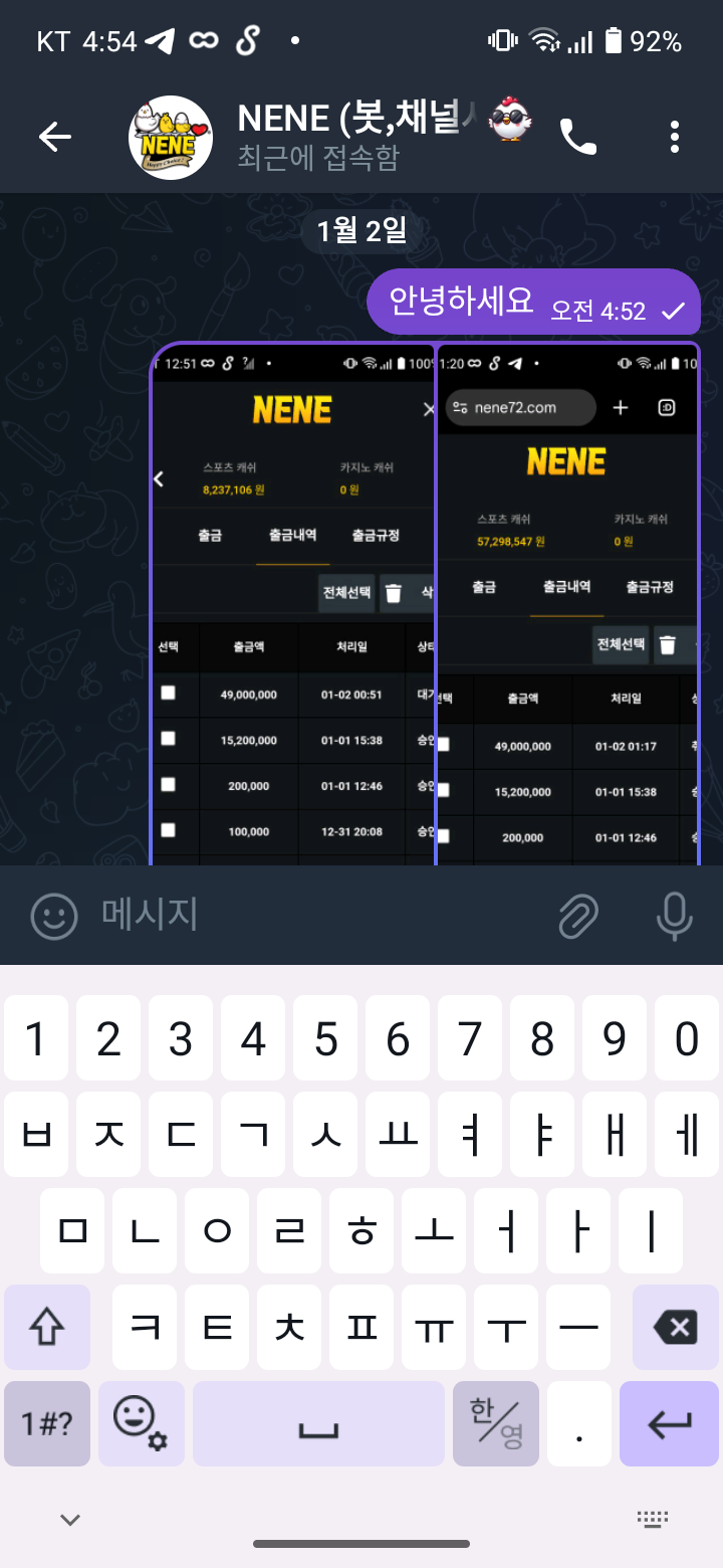 네네사이트에서  제가  그동안 4천500정도  넣고  요며칠새  4천정도  넣었어요  진짜 피같은  돈이어서 오늘  간신히  복구  해서  출금요청 하였더니  갑자기  텔레 로  소통원한다  하더니  잠시 기다리라해서  낌새가  이상해  그때부터 다캡쳐  하였습니다  제가  작업배팅을하고  동시접속을  했다고  하고  아이피 위치가  틀리다고  슬롯에  작업배팅은  첨들어본  얘기고