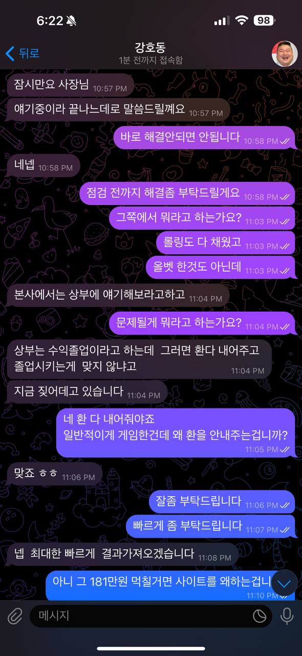 50만원 충전해서 181만원 환전 눌렀습니다 롤링은 거의 7-800% 넘는데 먹튀 사유는 돈 너무 따가서 먹튀 졸업이라하네요 ㅋㅋㅋㅋ 거지같은 새끼들 해결해준다고 몇일 기다리라고 했으면서 연락한통없네요 총판새끼들도 한패입니다 더러운 새끼들 본사 텔 @uuqq668800 총판상부 텔 @edgarh80 총판하부 텔 @vipssz88