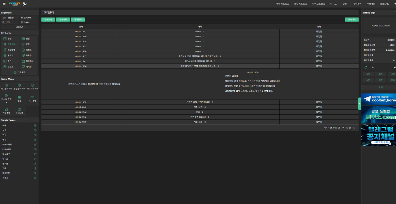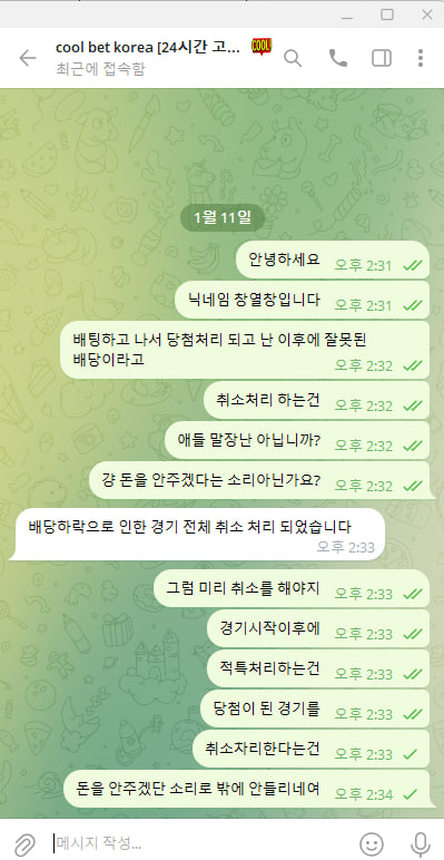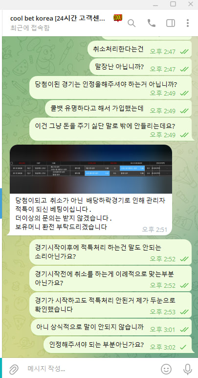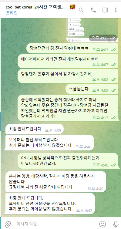 어제 축구 2폴 배팅후 경기보다가 잠들었는데 당첨되어서 아침에 환전할려고 하니 당첨금 회수 해가고 관리자 적특이라고 우기는 원어민 들입니다 고객센터도 챗gpt처럼  똑같은 말만 반복하고 말이 안통하네요