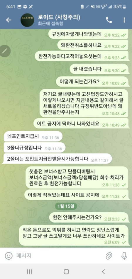 로이드라는 사이트 사람 가지고 놀고 먹튀 하는 사이트입니다 먹튀금 돌려주는 척 장난질 치고 절대 안 돌려주고 소액도 먹튀하는 사이트입니다 절대 사용하지마세요 제가 이 글 올리면 또 돈 준다고 하고 글 내려달라 연락 올탠데 이런 장난질하는 사이트입니다 로이드는 뭐든 꼭 거르세요 사기 당하지마세요 제가 싸게 먹혔다 생각할게.