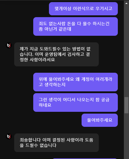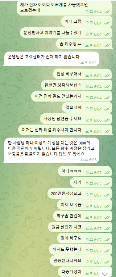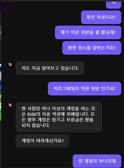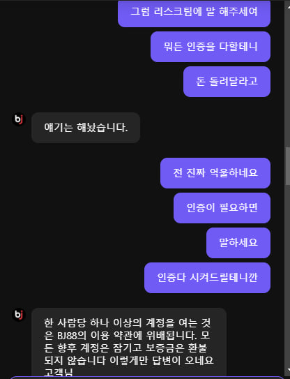bj88사이트 1/30일에 가입을해서 이용을 했습니다 200만원을 충전을하고 배팅을해서 낙첨이되서 낙포 포함으로 95만원이 있었습니다. 그래서 전 조금이라도 복구할 마음에 오대리그경기를 배팅을했습니다. 그래서 당첨이되서 이제 환전을할려고하니깐 20분정도 기달리니깐 회수처리라고 뜨길래 문의를 드리니깐 제명의로 계정이 몇개 있다고 돈을 다 회수 했습니다. 저는 그사람들이랑 저랑 동명인지 신분증 다까면되지않냐 요청했고 듣는둥 마는둥 운영팀 탓하며 자기는 잘못안한거마냥 병신긑이 뺴네요 ㅋㅋ 사이트 운영좆같이하는 비제이 88 개자슥들아 지금보니 글도 몇개 올라와있네 좆긑이 장사하지말고 시원하게 장사해라 300장도없는 개고아 사이트 ㅋㅋ